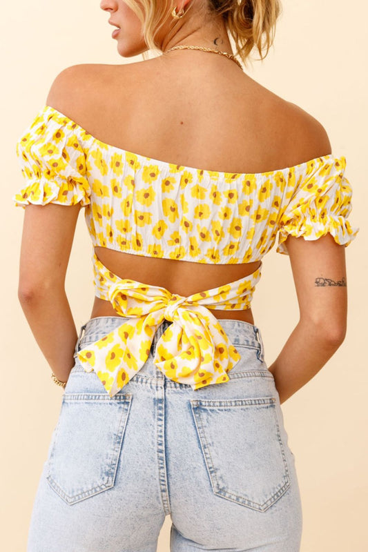 Flower Print Ruffle Trim Off-Shoulder Back Tie Blouse